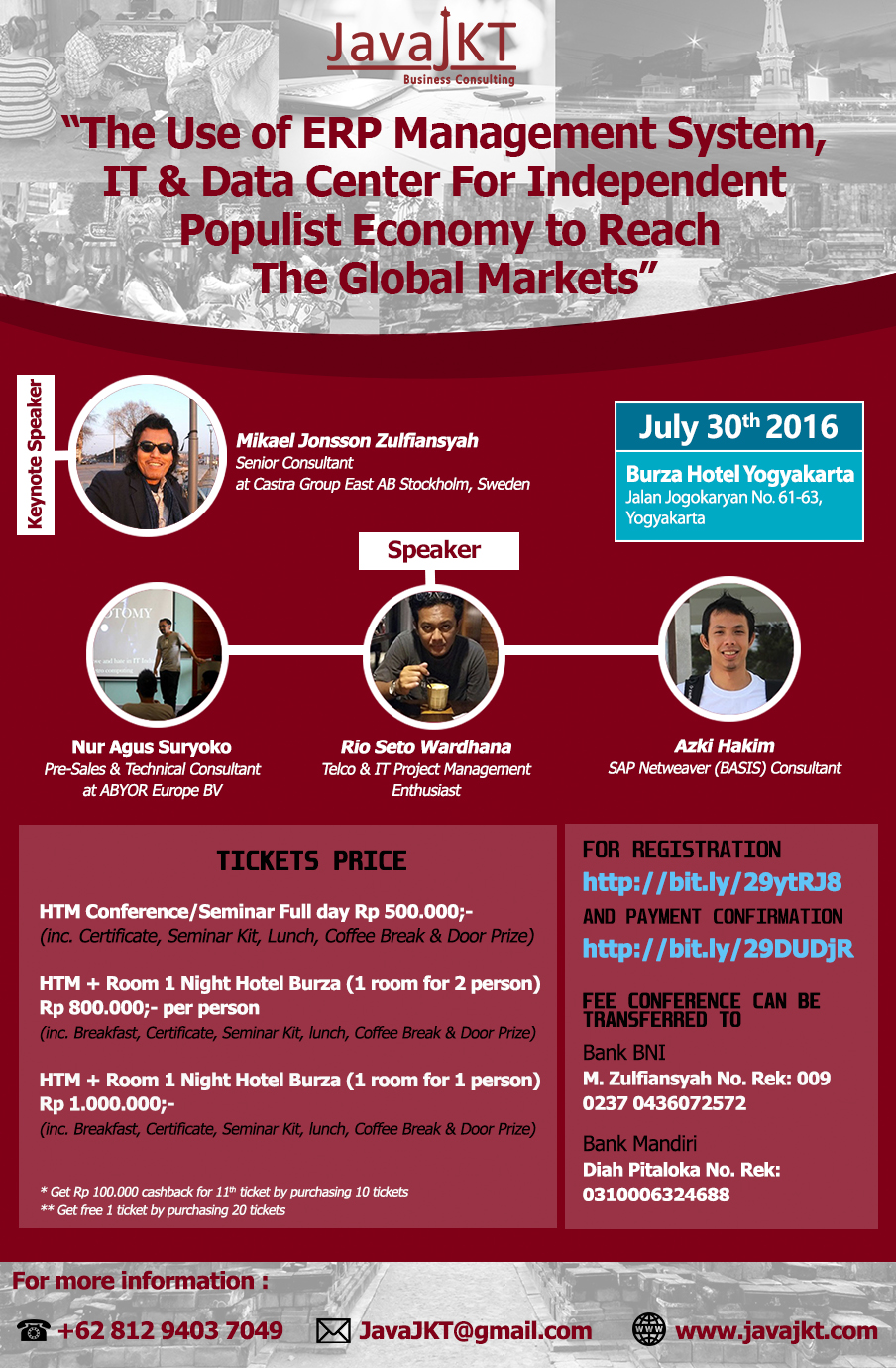 On behalf of JavaJKT ICT-IT Conference/Seminar/Training organizing committee, we would like to express our highest appreciation for your participation in the conference. This will be a great opportunity among the stakeholders (academia, researchers, engineer, consultant and many more) to meet and perform ideas-exchanging related with technology. As the importance and significant contribution from this conference in this area of expertise, we would like to invite you to attend JavaJKT Conference under the theme; “The Use of ERP Management System, IT & Data Center For Independent Populist Economy to Reach The Global Markets”.